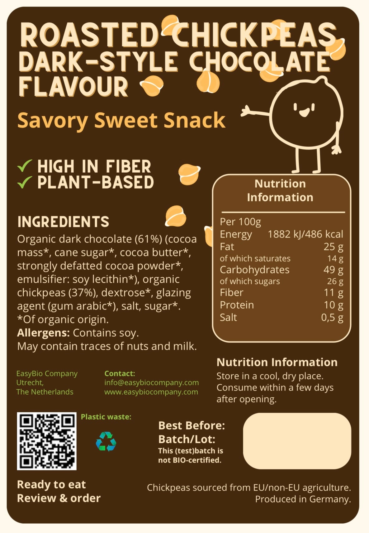 De dark-style chocolate variant is intens en vol van smaak. De lichte bitterheid van dark-style chocolade combineert mooi met de geroosterde kikkererwten. Voor wie houdt van een volwassen, minder zoete snack met karakter.